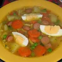 A csirkehúst zsíron fehéredésig sütjük,sózzuk,borsozzuk,és felengedjük annyi vízzel amennyi éppen ellepi.Főlpuhára pároljuk,majd hozzáadjuk a sárga,és a fehérrépát.Sóval,borssal,ptrezselyemmel,kevés majorannával ízesítjük.Tovább pároljuk,és amikor már a zöldségek is majdnem puhák,felengedjók vízzel,hozzáadjuk a krumplit,kicsit később a borsót,és a májgombócokat,majd együtt puhára főzzük.